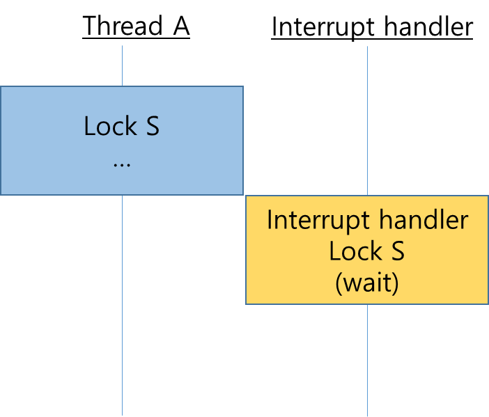 루틴에서 같은 lock을 두 번 호출하지 않았았는데도 불구하고 인터럽트 루틴에 의해 같은 lock이 호출되어 결국 두 번 사용되어지는 경우가 발생하는 경우 두 번째 lock 호출에서 무한 대기 상태가 된다