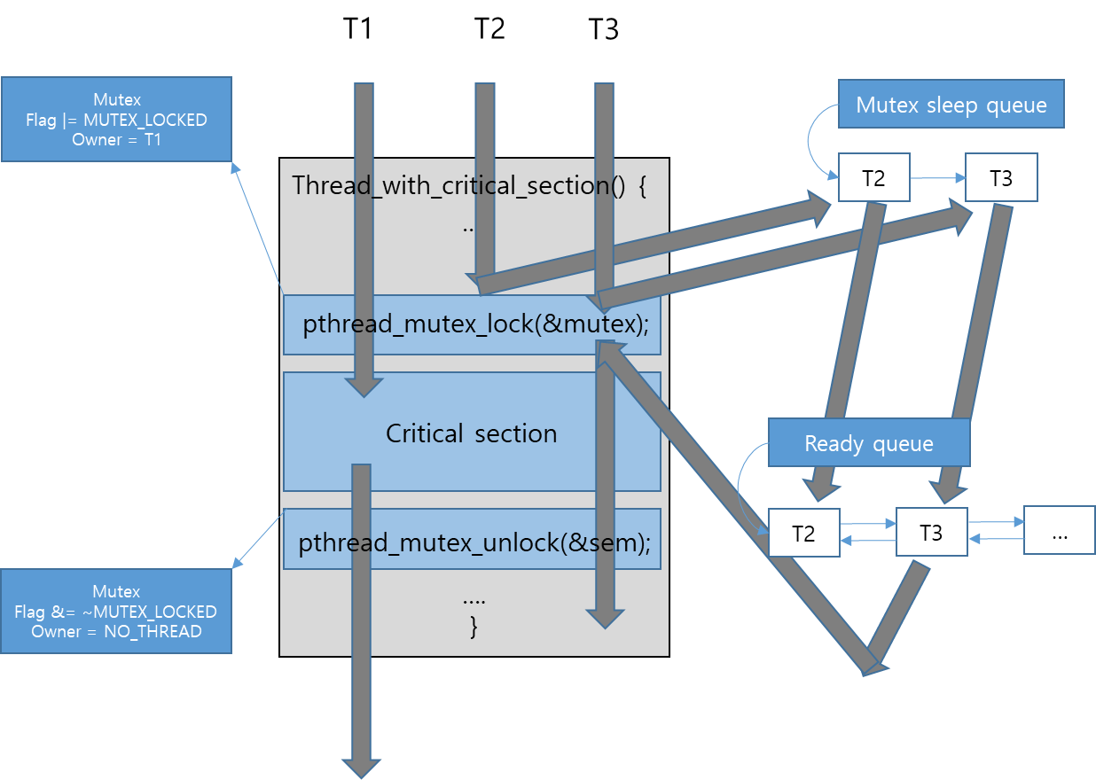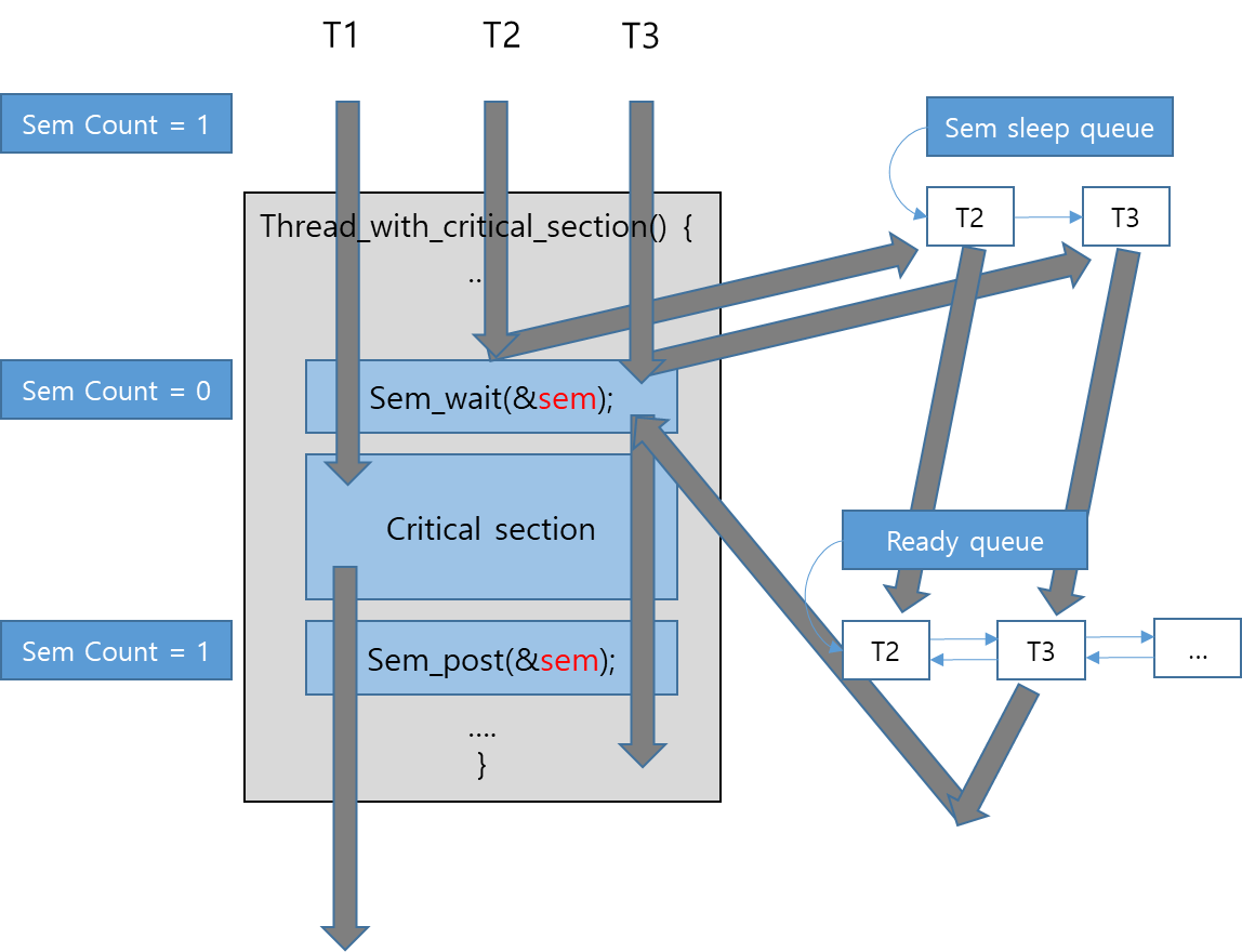 T1의 상호 배제 구역(Critical section) 수행 중에 sem을 잠그려한T2와 T3는 sem의 sleep queu에 들어가 block 된다.
