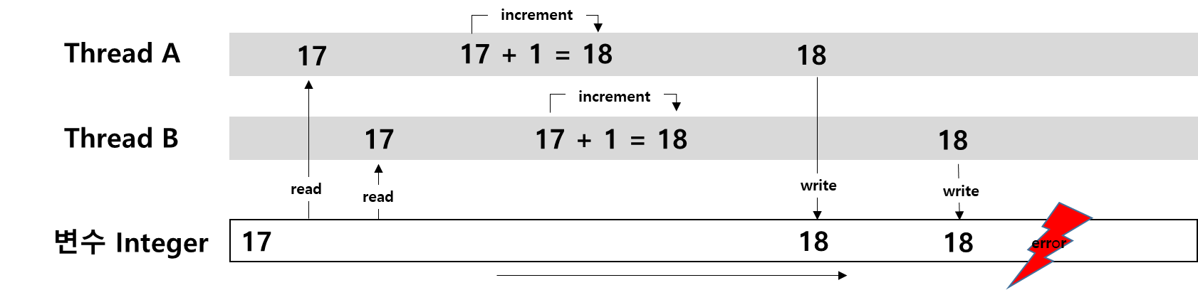 그림 1. 동기화 없는 연산은 매번 발생하는 일은 아니다. 간헐적으로 발생을 하며, 복잡한 시스템속에 이러한 버그가 있다면 매번 발생하는 경우가 아니기에 더욱더 버그를 잡기 어렵다. 그러므로 초기 프로그램을 설계할 때 아래 동기화 기법을 사용하여 소프트웨어를 설계하는게 중요하다.