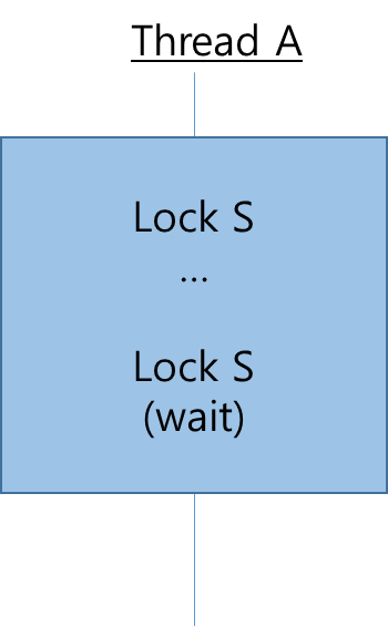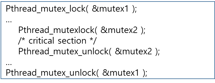 같은 lock을 두번 사용하는 경우 두 번째 lock 호출 시 무한 대기 상태가 된다.