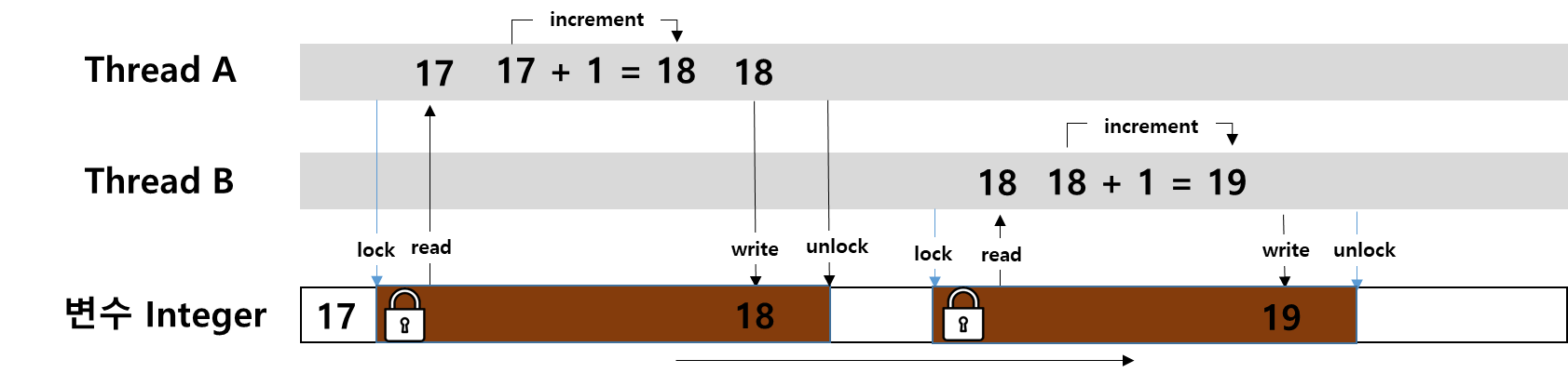 그림 1. 동기화 없는 연산은 매번 발생하는 일은 아니다. 간헐적으로 발생을 하며, 복잡한 시스템속에 이러한 버그가 있다면 매번 발생하는 경우가 아니기에 더욱더 버그를 잡기 어렵다. 그러므로 초기 프로그램을 설계할 때 아래 동기화 기법을 사용하여 소프트웨어를 설계하는게 중요하다.