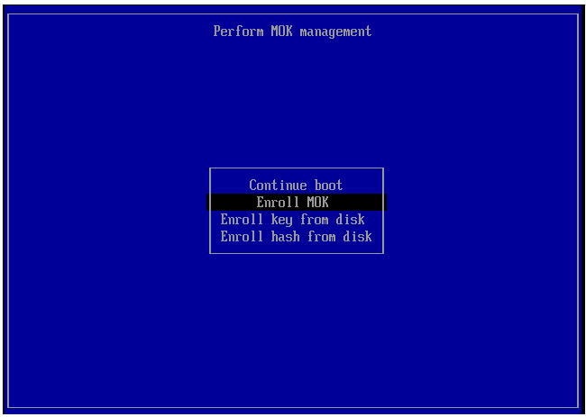 리붓 한뒤에는 부팅이 되기전 아래와 같은 창이 뜨는데 Enroll MOK을 선택하여 엔터입력을 한다.