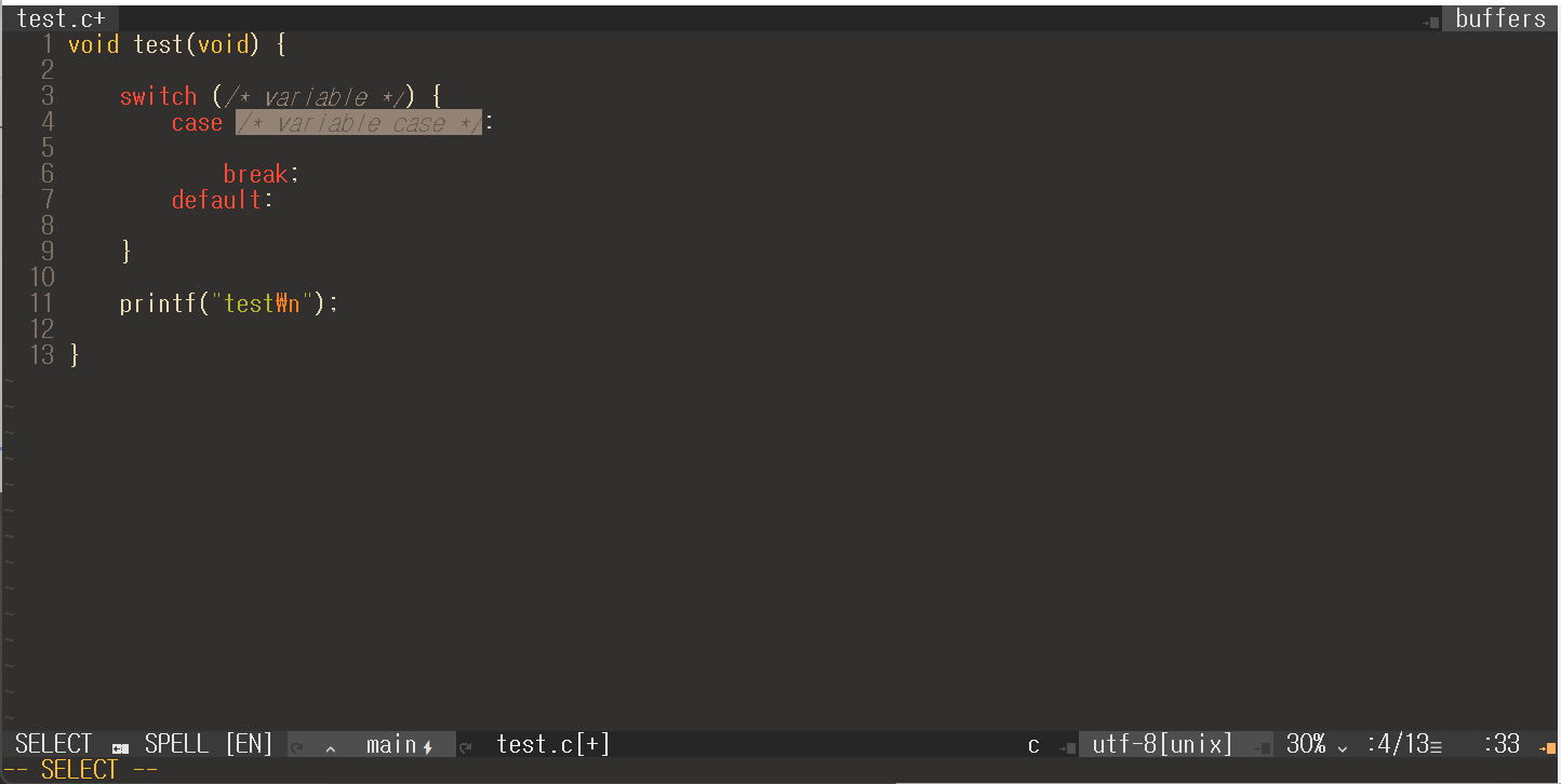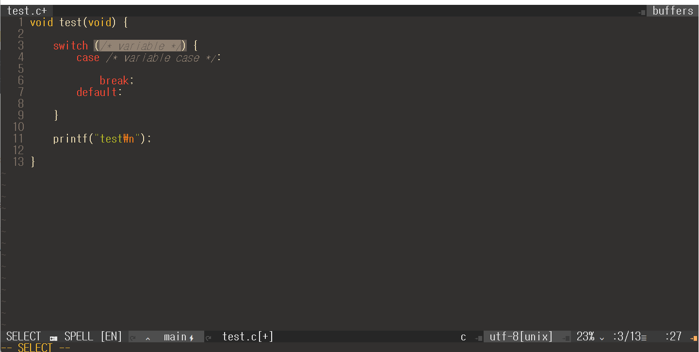 vim-snippets는 if, for, while 또는 switch case문과 같은 패턴이 정해져 있는 코드들을 사용자가 등록한 키에 의해 코드가 자동 완성되도록 ~/.vim/bundle/vim-snippets/snippets/c.snippets 해당 내용들이 적혀있습니다.