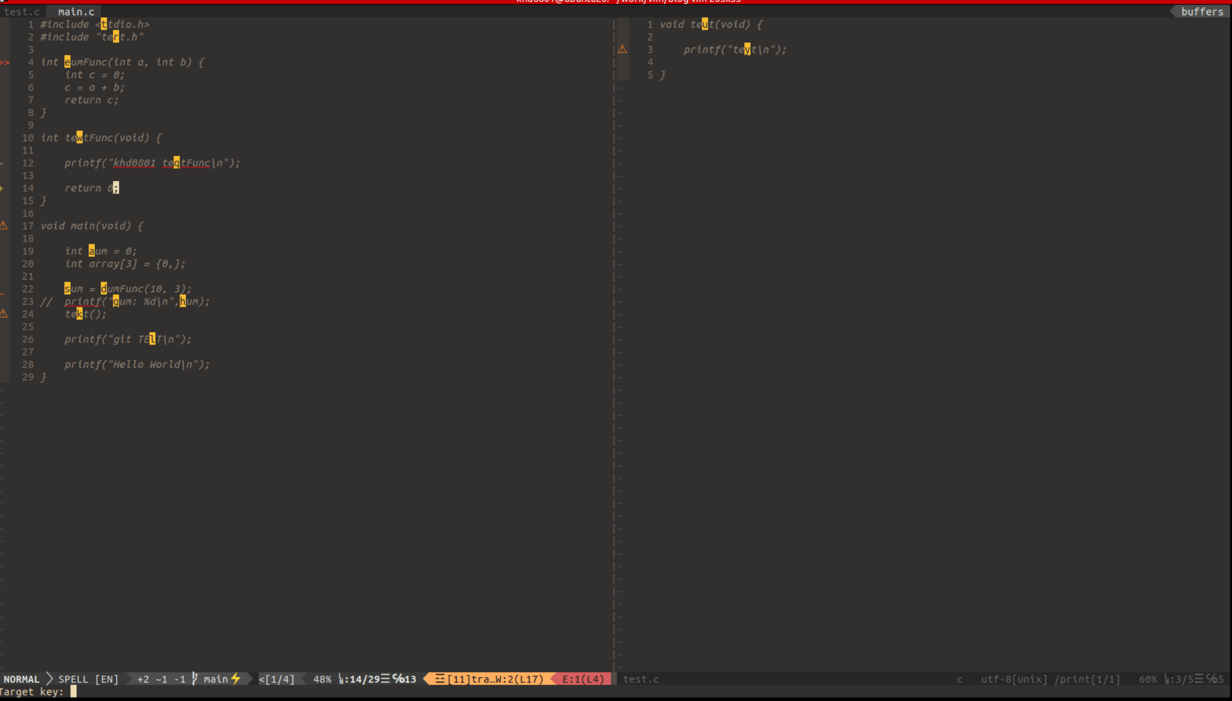 | 14번째 줄 | nmap <Leader><Leader>l <Plug>(easymotion-overwin-line) | 노멀모드에서 Leader키를 두번 누른 뒤 l를 누르면, 맨 왼쪽 열이 하이라이트되면서 해당 라인으로 이동 할 수 있는 마커가 생성된다. 이때, 해당 기호를 키보드로 입력하면 해당 라인으로 이동된다. |