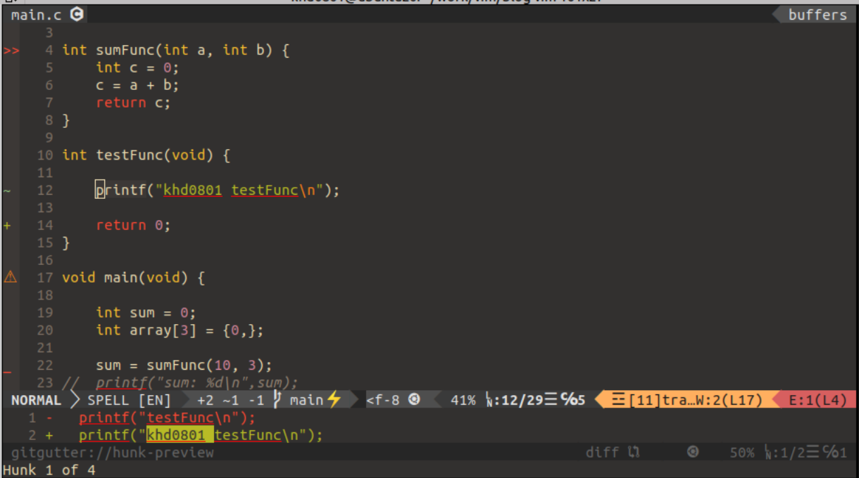 - hunk-preview 내용은 12번째 line의 코드가 어떻게 수정되었는지 preview로 보여준다.