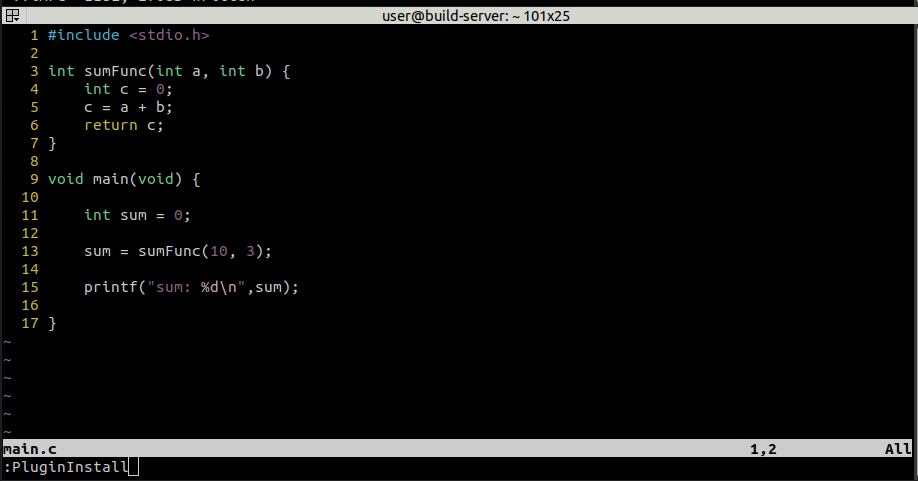 아래 화면 처럼 vim을 켜고 ":(세미콜론)"을 입력한 후 PluginInstall 명령을 실행한다.