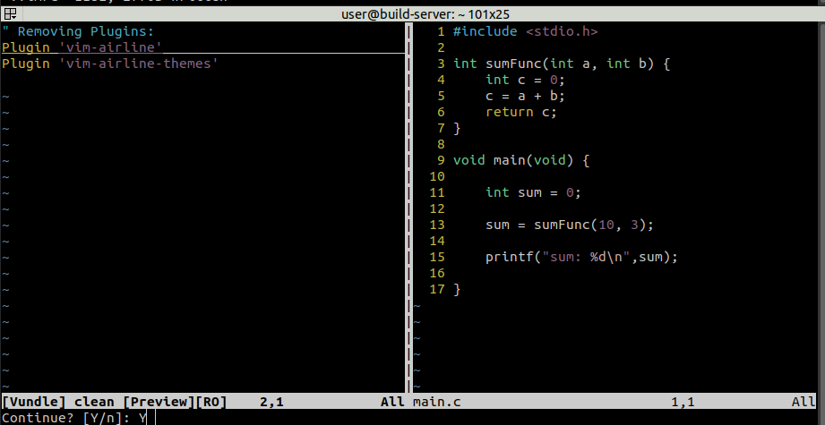 아래 그림과 같이 .vimrc에 있는 Plugin을 주석처리 하거나 삭제한뒤 ":PluginClean" 명령어를 실행하면 설치된 플러그인이 삭제 된다.